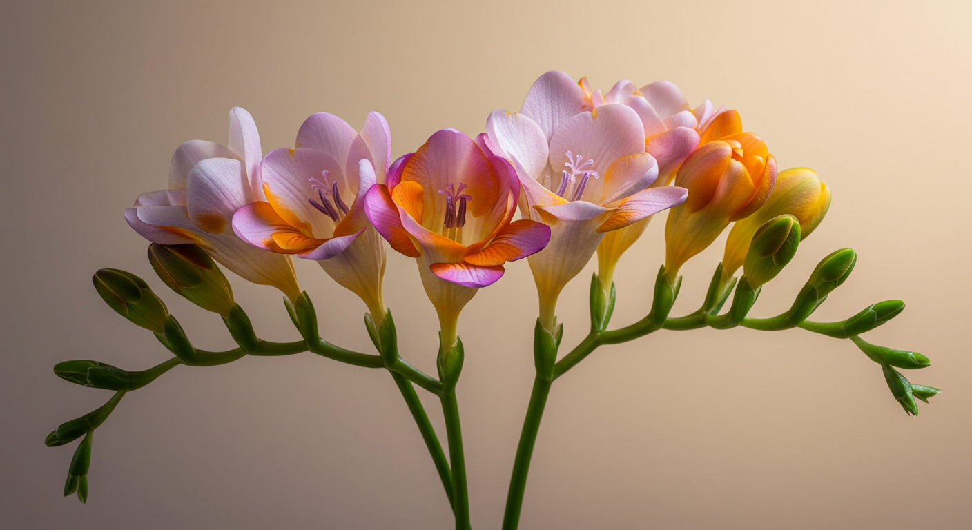 프리지아는 '당신을 생각하면 행복해집니다'라는 아름다운 꽃말을 가지고 있어요. 달콤한 향기와 함께 행복한 마음을 전할 수 있는 꽃이죠. 특히 노란 프리지아는 '영원한 행복'을 의미한다고 해요.