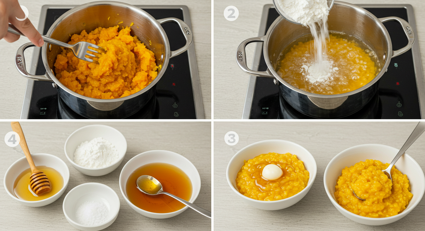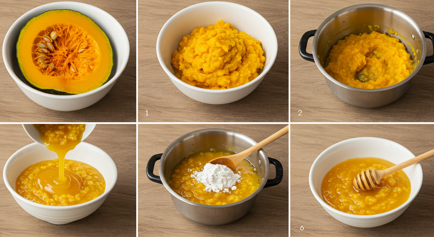 찐 호박을 으깨 물과 함께 끓이면서 쌀가루를 넣어 농도를 맞춥니다. 꿀이나 소금을 곁들여 취향에 맞는 맛을 내세요.